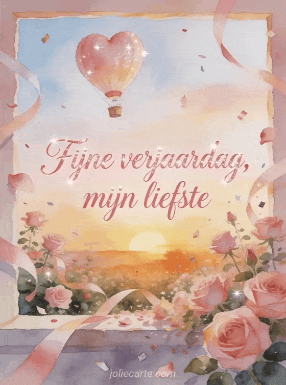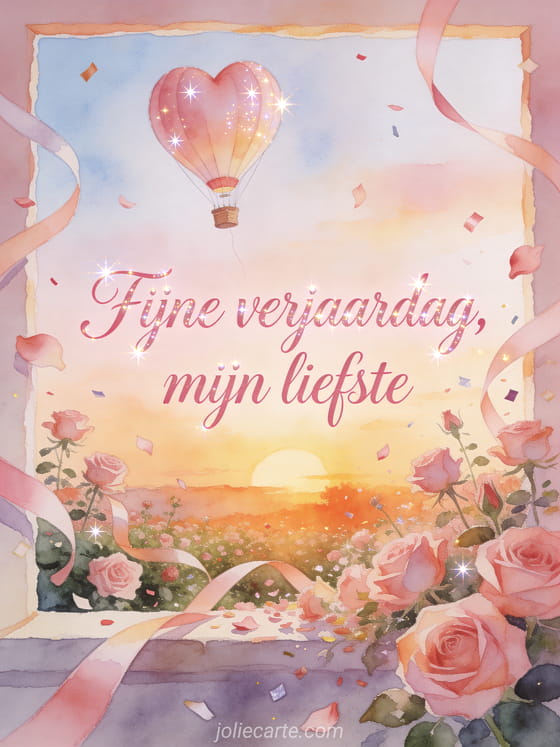 Deel een romantisch verjaardagsmoment met een aquarelkaart waarop een hartvormige luchtballon boven een zonsondergangstuin vol rozen, zwevende linten, bloemblaadjes en confetti zweeft. Personaliseer hem online en stuur hem gratis. Ontdek ook verjaardag mijn liefste, een fijne verjaardag kaart mijn liefde of een fijne verjaardag mijn liefste afbeelding.
