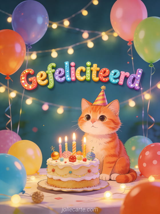 Maak de verjaardag van je vriendin extra bijzonder met deze kleurrijke kaart vol ballonnen en een schattige kat met feestmuts. Bekijk ook een verjaardagsbericht vriendin.