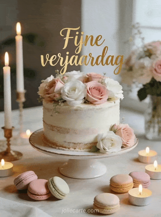 Deel een verfijnde verjaardagskaart met een bloemen-taart, macarons en warme kaarslichtsfeer voor een bijzonder moment. Bekijk ook bericht verjaardagskaart vrouw, mooie verjaardagstekst vrouw en gratis gefeliciteerd vrouw gif.