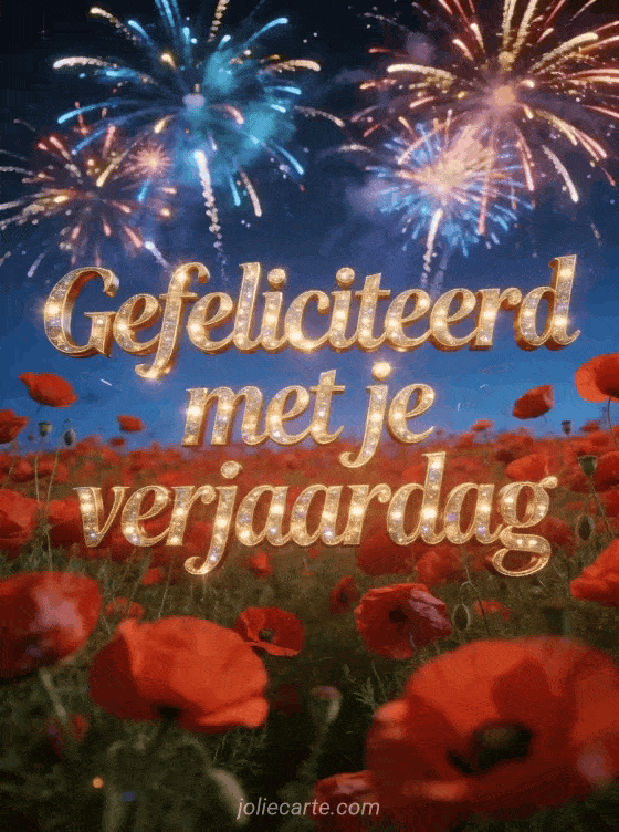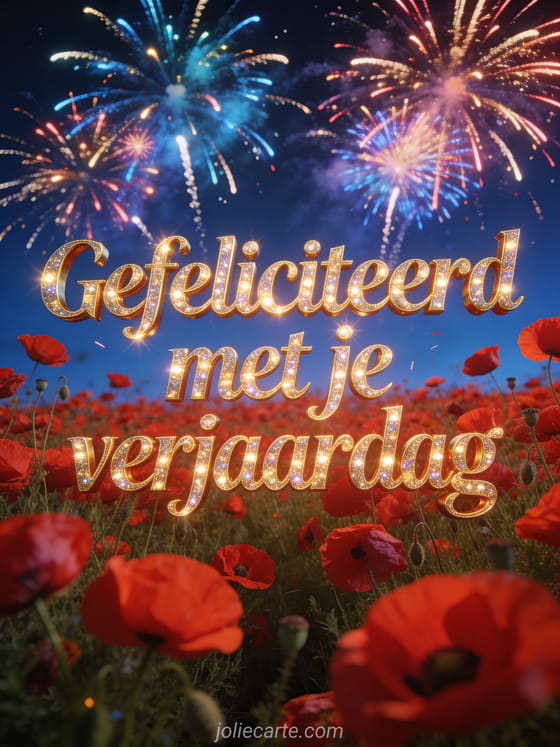 Kleurig vuurwerk explodeert in een nachtelijke hemel boven een rood klaproosveld in een levendige en feestelijke illustratie. Bekijk ook vriendin vriendschap gefeliciteerd verjaardag vrouw of verjaardagskaart vrouw humor.