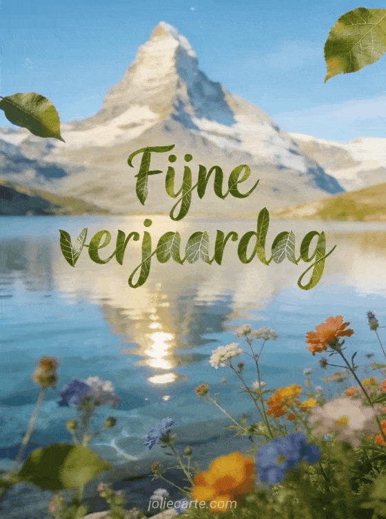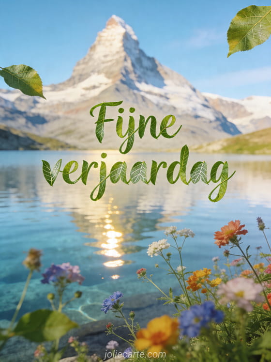 Deel een rustige verjaardagswens met deze fotorealistische kaart met bergen, een kristalhelder meer en wilde bloemen onder een blauwe lucht. Bekijk ook verjaardagskaart vrouw bloemenboeket, gratis grappige vrouw verjaardag gif of vrouw verjaardag foto.