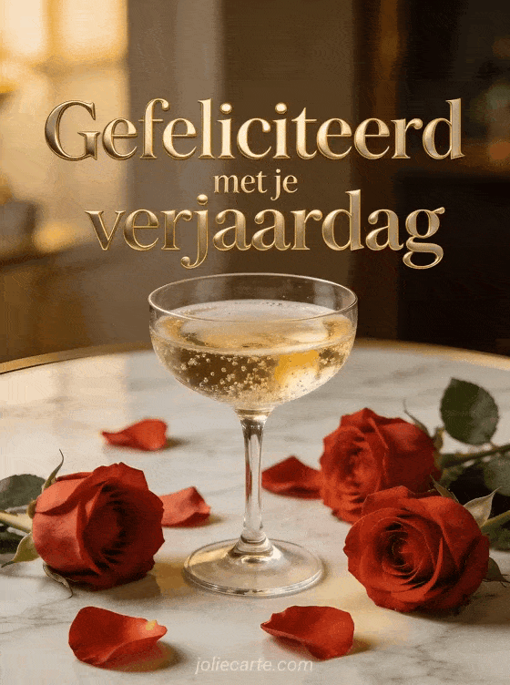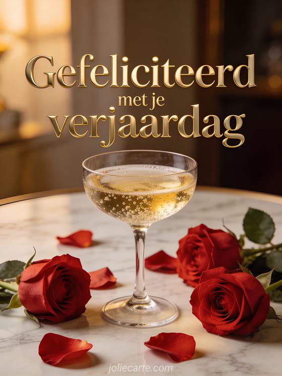 Een fotorealistisch glas champagne omringd door rode rozen op een marmeren tafel bij warme gedempte verlichting. Bekijk ook gefeliciteerd verjaardag vrouw.