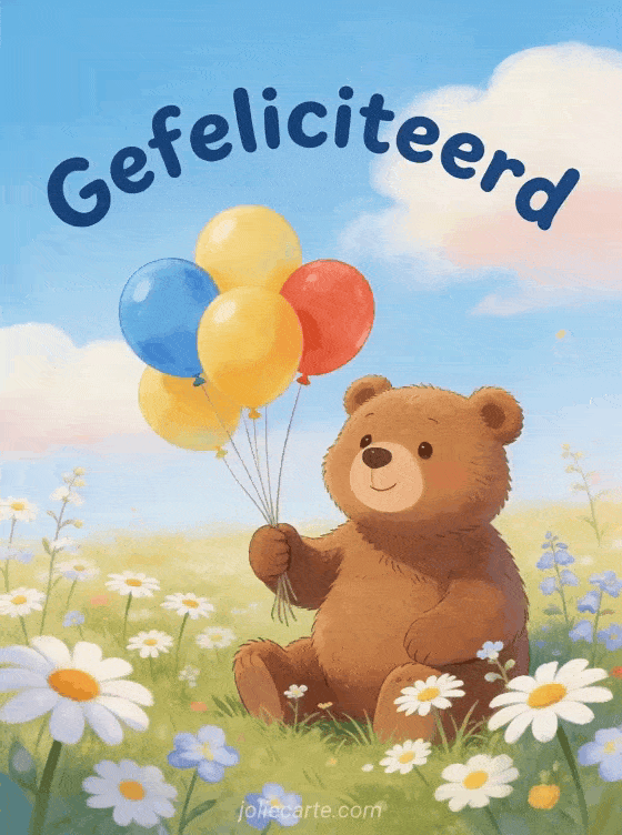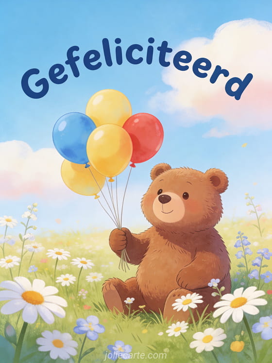 Deel een warme geïllustreerde verjaardagskaart met een schattige bruine beer die kleurrijke ballonnen vasthoudt in een bloemenweide onder een zachte blauwe hemel. Bekijk ook een gefeliciteerd mijn zoon, een grappige verjaardagswens voor mijn zoon of een verjaardagstekst voor mijn zoon.