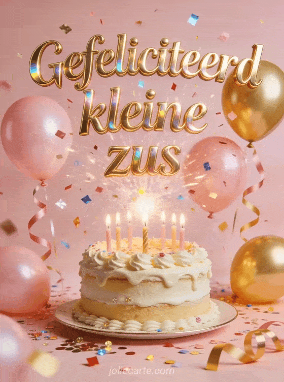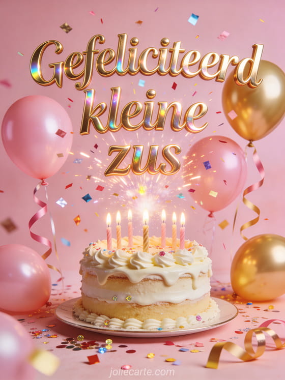 Gelukkige verjaardag kleine zus! Een explosie van kleurrijke confettis en slingers, roze en gouden ballonnen en een prachtige verjaardagstaart versierd met slagroom en kaarsen op een roze feestelijke achtergrond — speciaal voor haar.