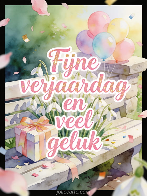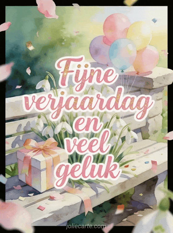 Deel een zachte verjaardagswens met roze aquarelletters, gouden glans, sneeuwklokjes, een geschenkdoos met lint, pastelballonnen en fris ochtendlicht. Stuur ook een fijne verjaardag mama geanimeerde gif, een tekst om fijne verjaardag tegen je mama te zeggen of een geanimeerde gif fijne verjaardag mama gif.