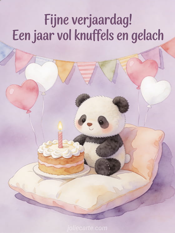 Vier het eerste jaar van een baby met een zachte illustratie van een pluche panda op een zacht kussen naast een verjaardagstaart met kaars, kleurrijke vlaggetjes, roze en witte hartballonnen en een warme lavendelachtergrond. Ontdek ook tekst eerste verjaardag baby, fijne verjaardag mijn baby of fijne verjaardag mijn baby 1 jaar.