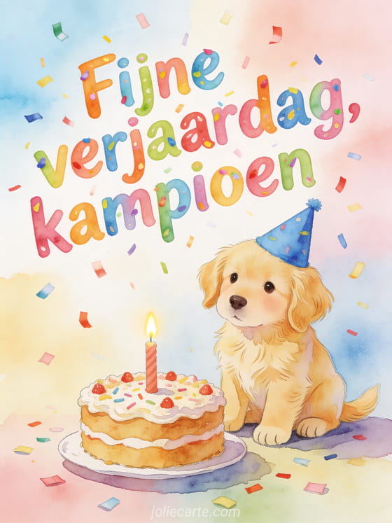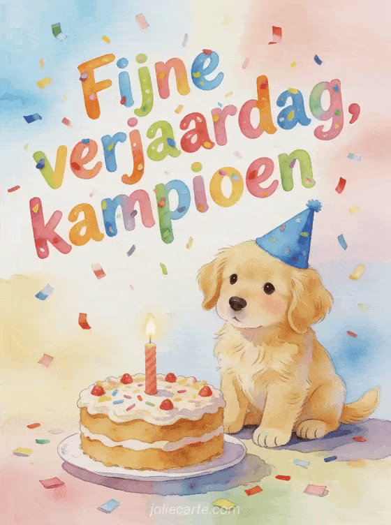 Stuur je kampioen een hartverwarmend verjaardagsbericht met een schattige golden retriever pup, een blauw feesthoedje, een taart met een kaars en kleurrijke confetti. Ontdek ook lach zonder vreugde, verjaardagstekst voor mijn kleinzoon of verjaardagswensen voor mijn kleinzoon.