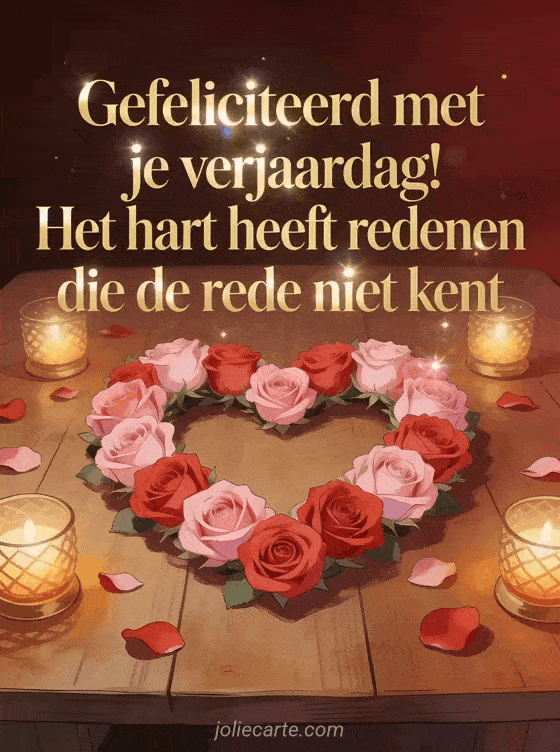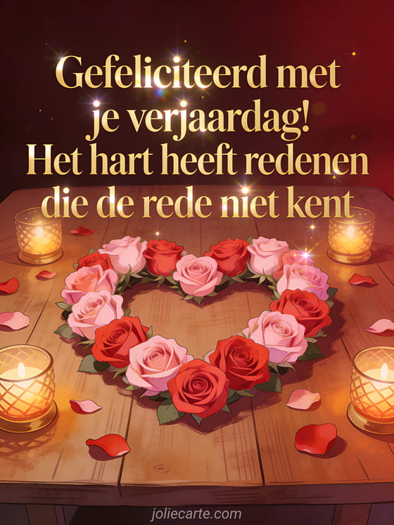 Deel een ontroerende felicitatie met deze warme verjaardagskaart met een hart van verse bloemen, zacht kaarslicht en elegante details. Bekijk ook een verjaardagsbericht sturen, tekst verjaardag voor fietser en vriendin tekst verjaardag.