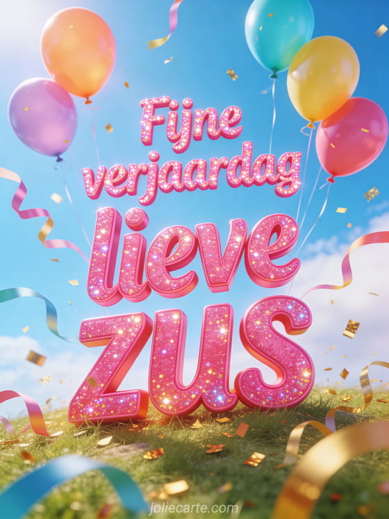 Stuur je zus een liefdevol bericht op haar verjaardag. Een boeket kleurrijke heliumballonnen stijgt op in een stralende blauwe hemel met golvende linten en een paar gouden confettis — luchtig en blij. Ontdek ook een grappig gefeliciteerd mijn zus humor of een verjaardag zus.