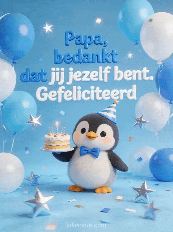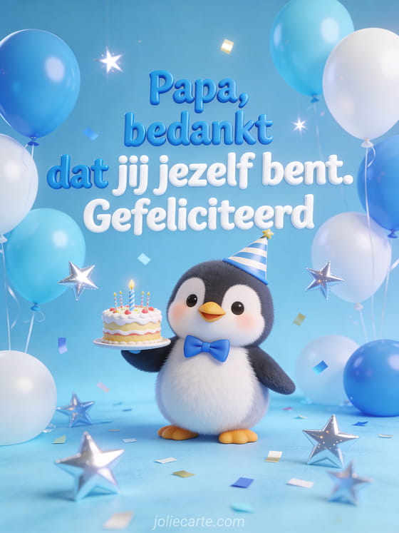 Stuur papa een schattig verjaardagsbericht met een pinguïn in een feestmuts die een mini verjaardagstaartje vasthoudt. Bekijk ook grappig gefeliciteerd papa humor of grappige tekst verjaardag papa.