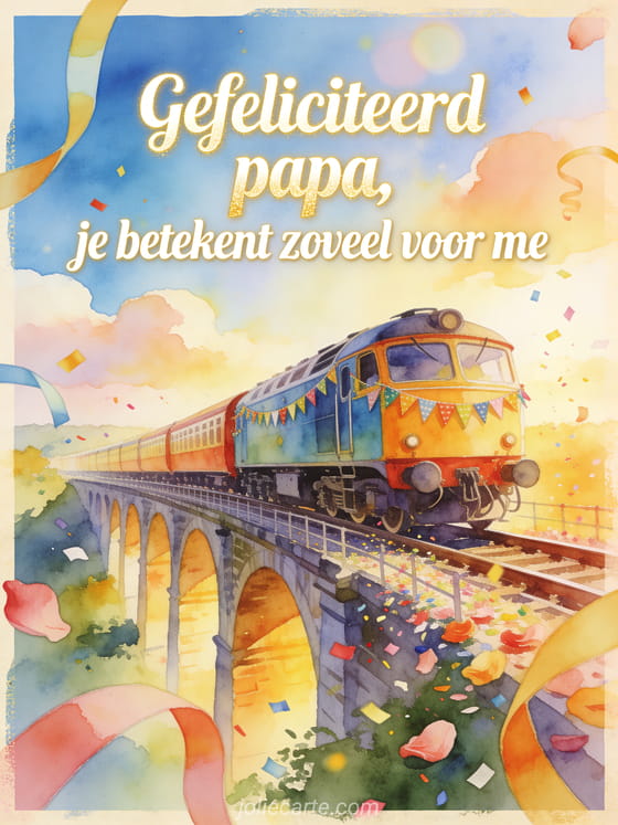 Stuur een verjaardagsbrief voor zijn papa met lichtgevende ivoorkleurige tekst, een heldere vintage trein met vlaggetjes op een zonnig viaduct, plus linten, bloemblaadjes en confetti over de rand. Ontdek ook een gefeliciteerd stiefpapa kaart, papa ik wens je een fijne verjaardag of een fijne verjaardag papa kaart.