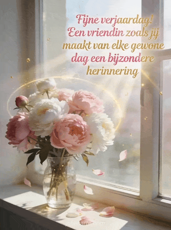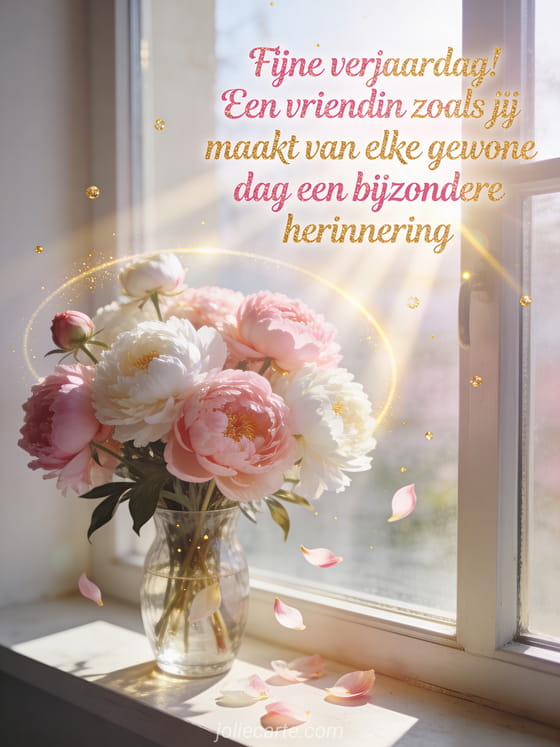 Stuur een verjaardagscitaat voor je beste vriendin met een elegante bloemenkaart van pioenrozen, zachte bloemblaadjes en gouden glans. Bekijk ook vrolijke verjaardagsquote, gefeliciteerd met je verjaardag citaten en citaat verjaardag voor een vriendin.