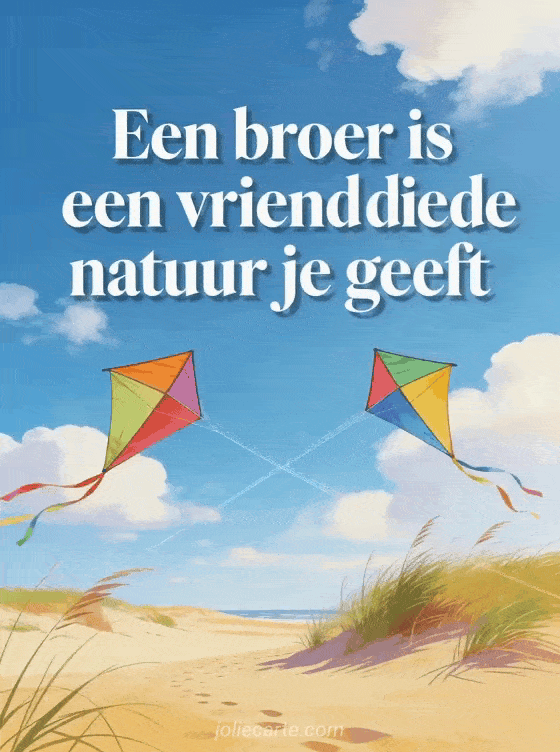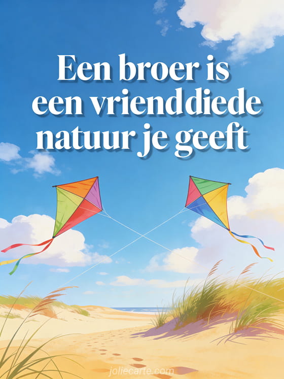 Deel een lief verjaardagscitaat voor je broer met twee kleurrijke vliegers die naast elkaar vliegen in een blauwe zomerlucht boven goud zand en duingras. Je kunt ook een mijn broer fijne verjaardag broer humor, een fijne verjaardag kleine broer of een verjaardag kleine broer kaart sturen.