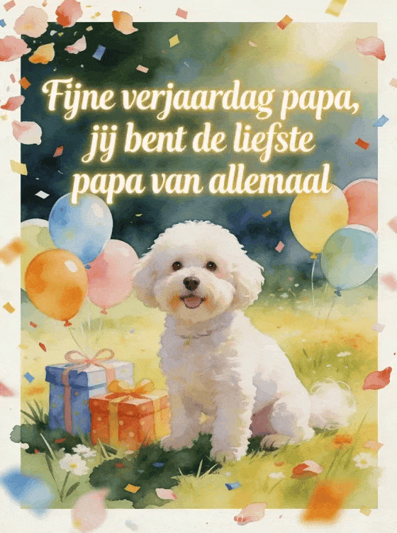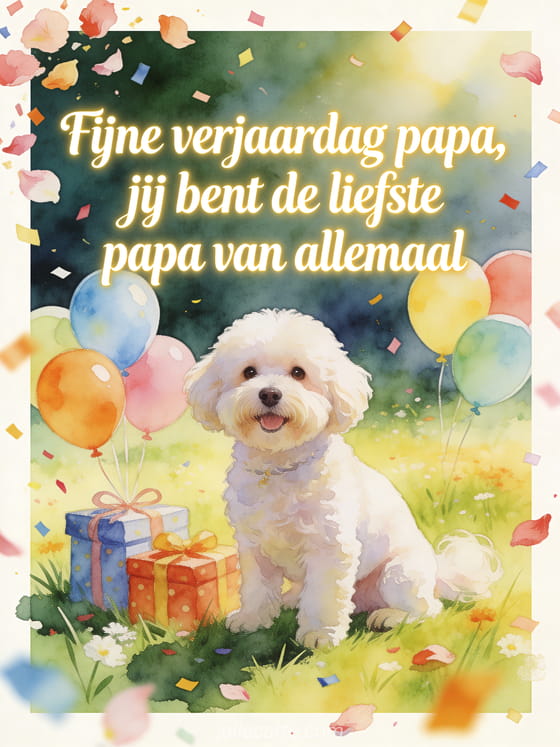 Deel een verjaardagsgedicht voor papa van een kind met een Bichon Frisé hond in een heldere weide naast cadeaus en verjaardagsballonnen. Kies ook voor verjaardagsgedicht voor papa, verjaardagstekst voor je papa of gefeliciteerd met je verjaardag papa gif.