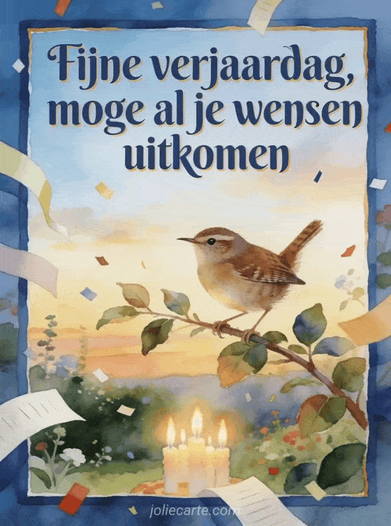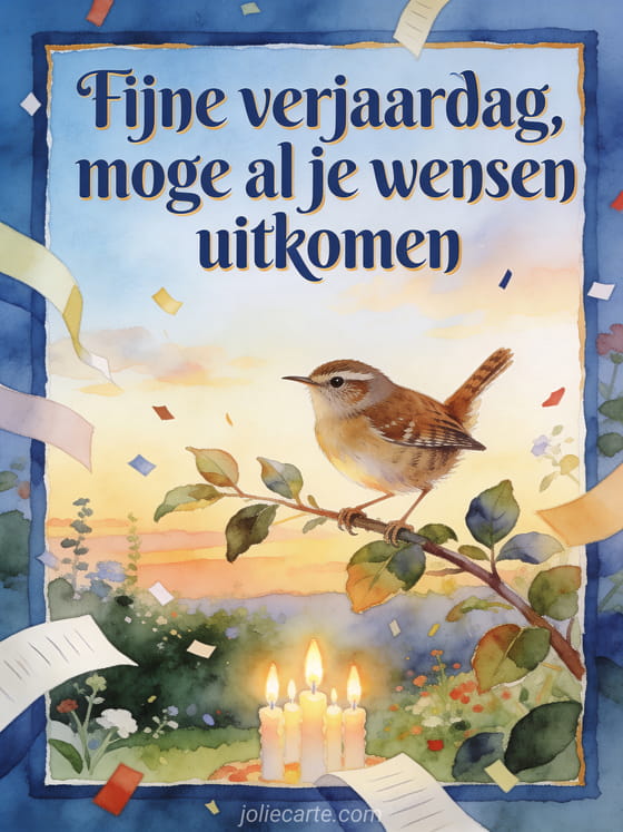 Stuur een poëtische verjaardagswens met een winterkoning op een bladerrijke tak, brandende kaarsen en een aquareltuin bij zonsopkomst. Linten en confetti maken de scene helder en feestelijk. Ontdek ook gefeliciteerd mijn volwassen zoon, een gratis verjaardag kaart volwassen zoon of een gedicht van een moeder aan haar zoon voor zijn verjaardag.