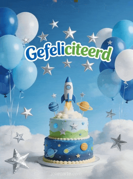 Vier met een geanimeerde verjaardagskaart voor een jongen, vol sterren, ballonnen en een feestelijke taart. Bekijk ook geanimeerde fijne verjaardag kaart, geanimeerde verjaardagskaart en geanimeerde verjaardagskaart hond.