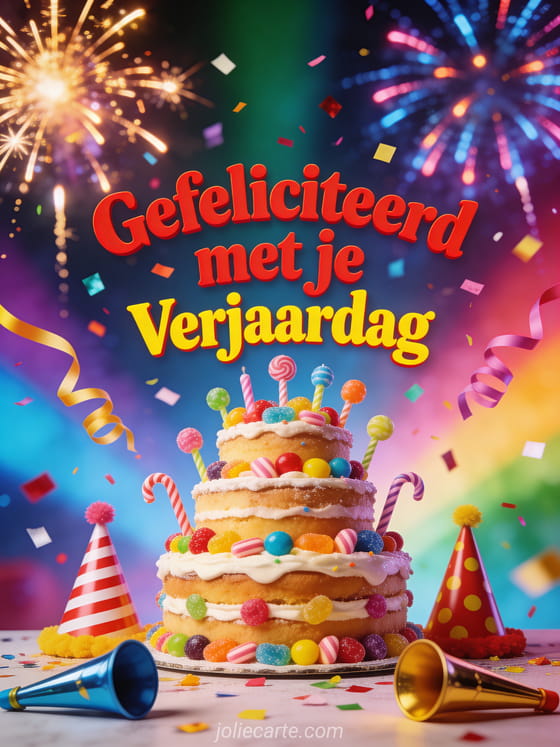 Verras een kind met deze feestelijke verjaardagskaart met een enorme laagjestaart vol snoep en lollies. Ontdek ook een model tekst verjaardagskaart kind of een virtuele kaart verjaardag kind prinses.