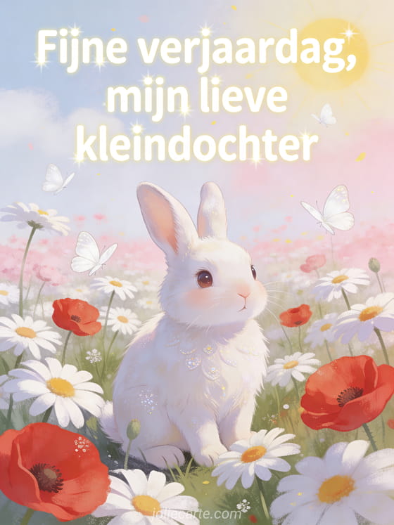 Stuur een zachte verjaardagskaart voor je lieve kleindochter met een klein wit konijn dat tussen margrieten en klaprozen zit, omringd door witte vlinders in lentelicht. Ontdek ook verjaardag kleindochter of fijne verjaardag mijn kleindochter kaart.