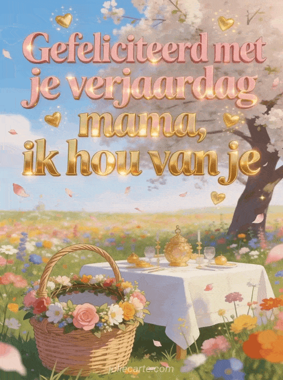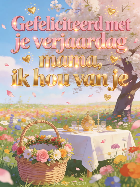 Vertel mama dat je van haar houdt met roze en gouden letters, een helder lenteveld vol wilde bloemen, een feestelijke bloemenkrans op een rieten mand, een tafel onder een bloeiende boom, vliegende bloemblaadjes en gouden harten. Stuur ook gefeliciteerd met je verjaardag mama afbeeldingen, een gefeliciteerd met je verjaardag mama geanimeerde kaart of een gefeliciteerd met je verjaardag mama gif.