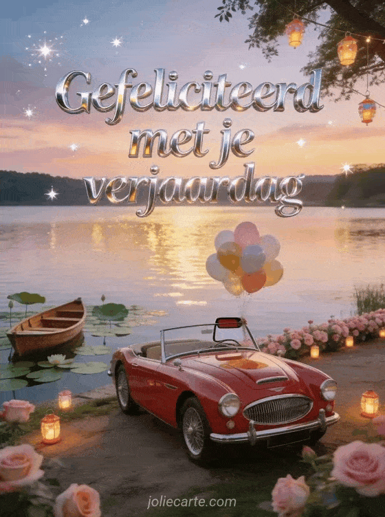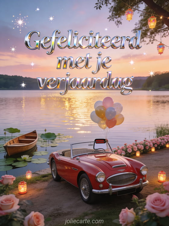 Vier zijn verjaardag met een verfijnde illustratie van een glanzende rode klassieke cabrio aan een rustig meer, met waterlelies, stokrozen, feestelijke lampionnen, gouden reflecties op het water en ballonnen. Ontdek ook een kaart met man verjaardag grap, een kaart met verjaardag man humor of een grappig verjaardagskaart man.