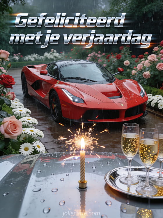 Verras een man met deze elegante verjaardagskaart met een rode sportwagen in een bloeiende rozentuin in de regen. Ontdek ook een gratis verjaardagskaart man dromadaris of een verjaardagskaart man oldtimer.