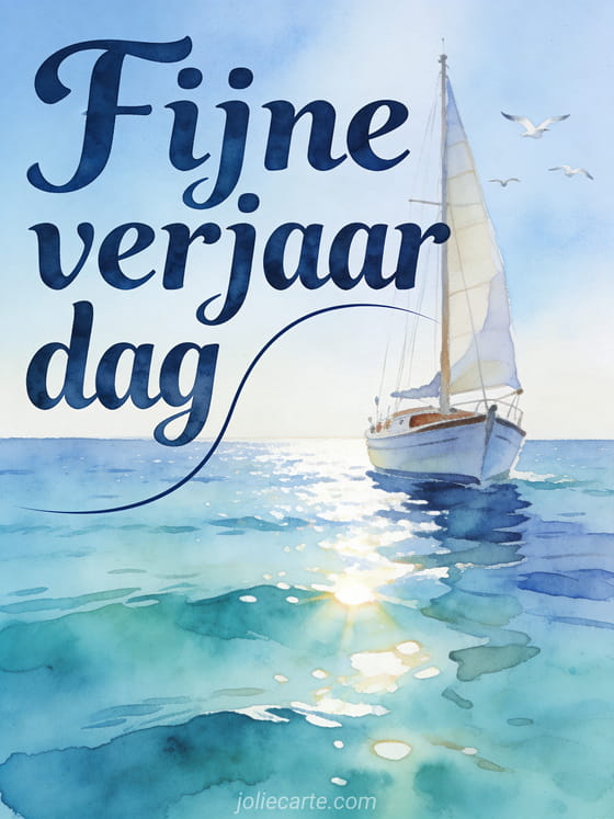 Deel een rustige maritieme verjaardagskaart met een zeilboot op turquoise water, zonreflecties en meeuwen onder een heldere hemel. Bekijk ook een verjaardag zoon, een gefeliciteerd mijn zoon of een grappige verjaardagswens voor mijn zoon.