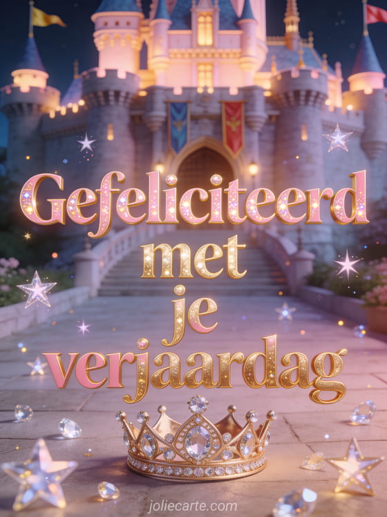 Stuur een magische koninklijke verjaardagsgroet met een verlicht sprookjeskasteel met torens en vlaggen. Een gouden prinsessenkroon met edelstenen en glinsterende sterren maken de magie compleet. Bekijk ook gefeliciteerd verjaardag bloemen gif geanimeerd gratis of boeket bloemen gefeliciteerd verjaardag geanimeerd.