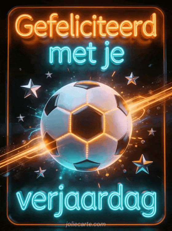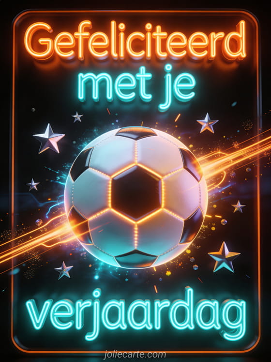 De perfecte verjaardagskaart voor een tiener die voetbal adoreert. Een lichtgevende realistische voetbal met lichtsporen, glinsterende sterren en energiedeeltjes op een zwarte achtergrond in oranje en cyaan neon kleuren. Ontdek ook een tiener gefeliciteerd verjaardag meisje of een afbeelding verjaardag tienermeisje.
