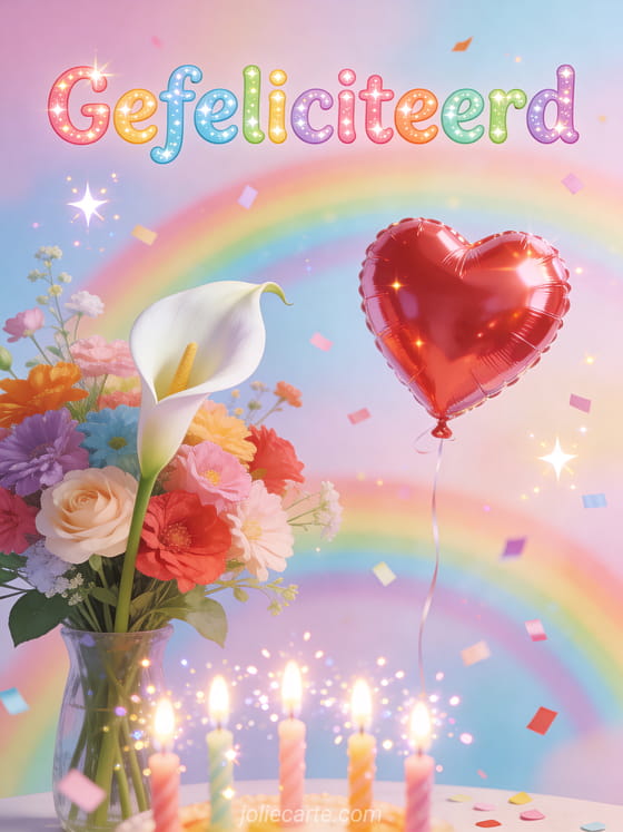 Stuur een lieve verjaardagskaart voor tieners met een kleurrijk boeket, dubbele regenboog en glinsterende kaarsen. Bekijk ook een verjaardagsbericht voor tiener of een gif verjaardag tiener.