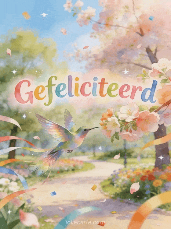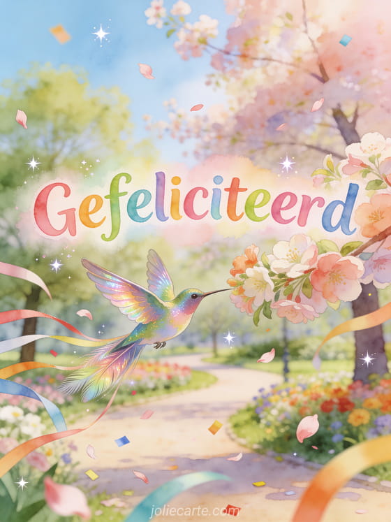 Stuur een vrolijke verjaardagskaart voor je zus met een kolibrie in een bloeiend lentepark vol confetti en slingers. Bekijk ook een tekening verjaardag zus of een gefeliciteerd mijn zus humor.