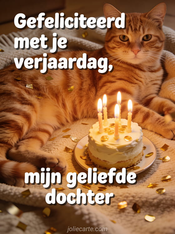 Verrast je volwassen dochter met deze gezellige kaart. Een rood tijgerkat ligt behaaglijk op een beige plaid naast een kleine verjaardagstaart met brandende kaarsen en gouden confettis in warm licht. Ontdek ook een tekst verjaardag voor je volwassen dochter.