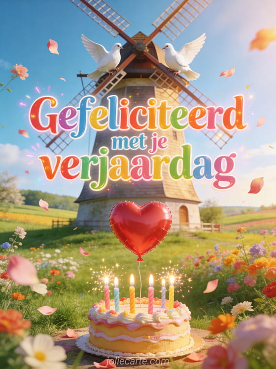 Deel een kleurrijke verjaardagskaart met een molen in bloeiende groene velden, witte duiven, een rode hartballon, fonkelende kaarsen en een mooie taart. Bekijk ook een gefeliciteerd met je verjaardag zoon gif, een gefeliciteerd met je verjaardag jongen gif of een fijne verjaardag mijn lieve zoon.