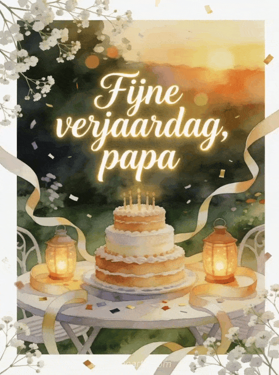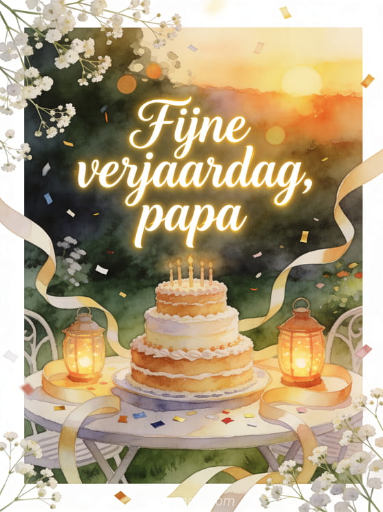 Deel een verjaardagskaart voor papa met een meerlaagse verjaardagstaart op een tuintafel, omringd door krullende linten en gloeiende lantaarns. Kies ook voor gedicht gedicht papa fijne verjaardag, verjaardagsgedicht papa voor kind of verjaardagsgedicht voor papa.