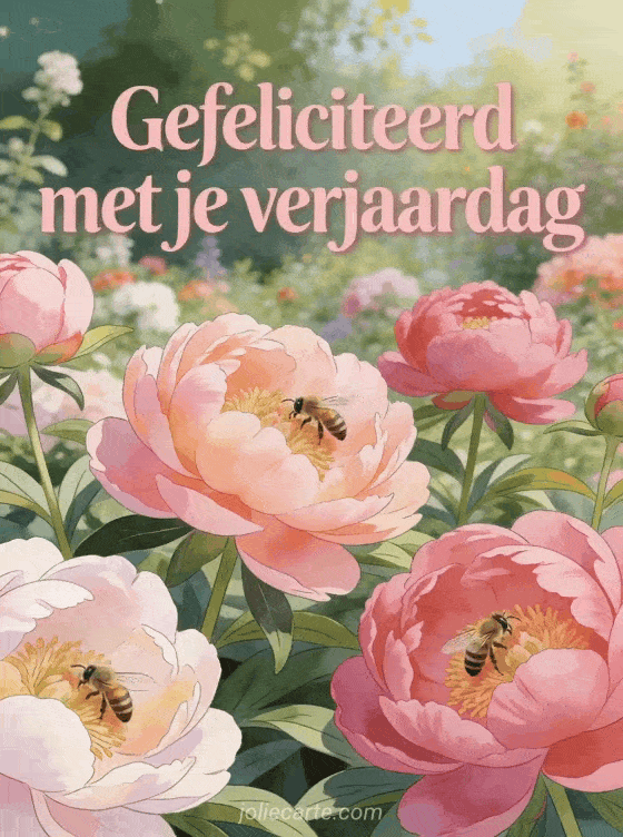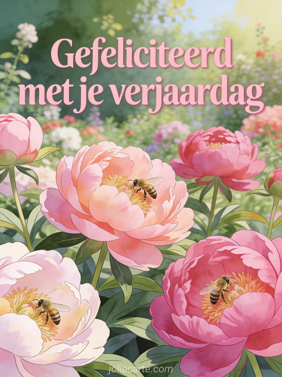Verras haar met de schoonheid van de natuur op haar verjaardag. Een weelderige pioenroos tuin in volle bloei, van lichtroze tot fuchsia, met honingbijen in zacht voorjaarslicht — als een botanische tuin in haar handen. Ontdek ook een champagne verjaardag vrouw of een e-card verjaardag vrouw.