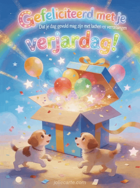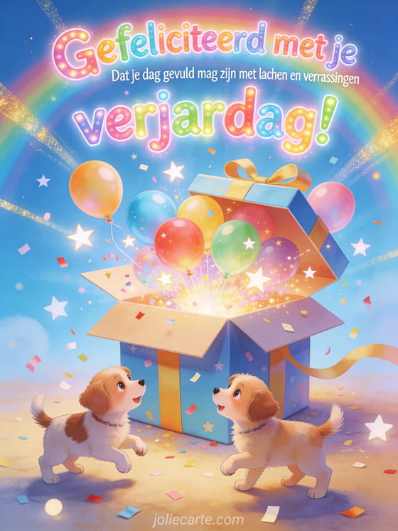 Verras een jong kind met deze magische verjaardagskaart vol confetti, ballonnen en spelende hondjes. Ontdek ook een afbeelding gefeliciteerd met baby of een bericht gefeliciteerd grappig kind.