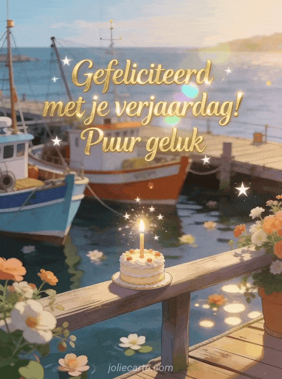 Stuur een warme gratis verjaardagswens met een bloemenkaai en kleurrijke vissersboten, een elegant taartje met fonkelende kaars. Ontdek ook gelukkige verjaardag wensen, gelukkige verjaardag oppas of landschap gelukkige verjaardag natuur.