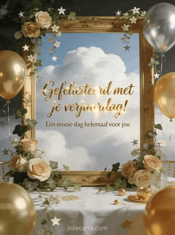 Stuur warme gratis verjaardagswensen met een antieke gouden lijst omringd door rozen, jasmijn en gouden ballonnen. Ontdek ook gelukkige verjaardag girly, verjaardagswens of gelukkige verjaardag wensen.