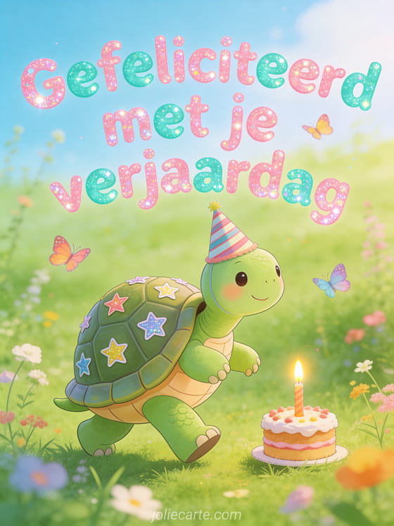 Verras een baby met deze lieve verjaardagskaart met een schattige schildpad met feestmuts en kleurrijke vlinders. Ontdek ook een gefeliciteerd kleine jongen of een verjaardagstekst voor een jong kind.