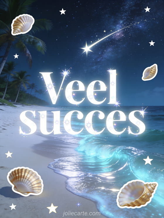 Stuur een betoverende virtuele geanimeerde veel succes kaart met een wit strand onder een sterrenhemel met vallende ster en fosforescerende golven. Bekijk ook een geanimeerde kaart veel succes of een bericht veel succes wedstrijd.