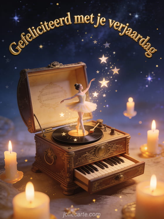Stuur een sprookjesachtige nostalgische verjaardagsgroet met een antieke muziekdoos waaruit een ballerina en sterren komen. Drijvende kaarsen en een sterrenhemel maken de magie compleet. Bekijk ook gefeliciteerd verjaardag geanimeerd gratis of gif verjaardag gratis geanimeerd.