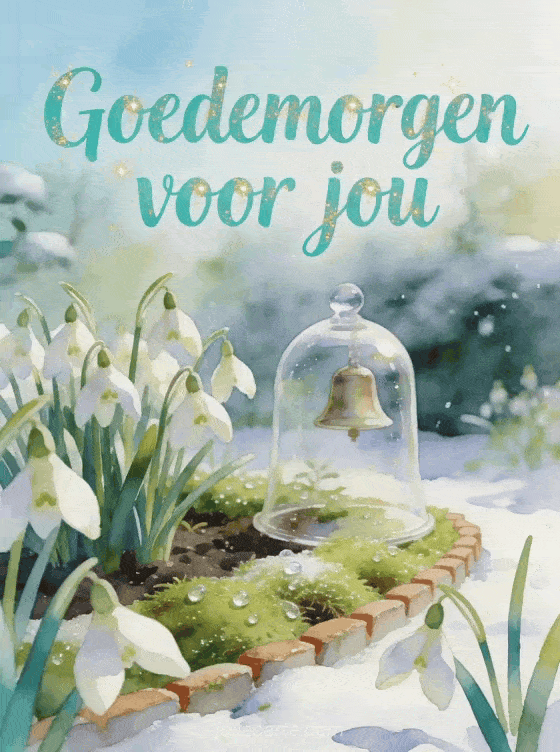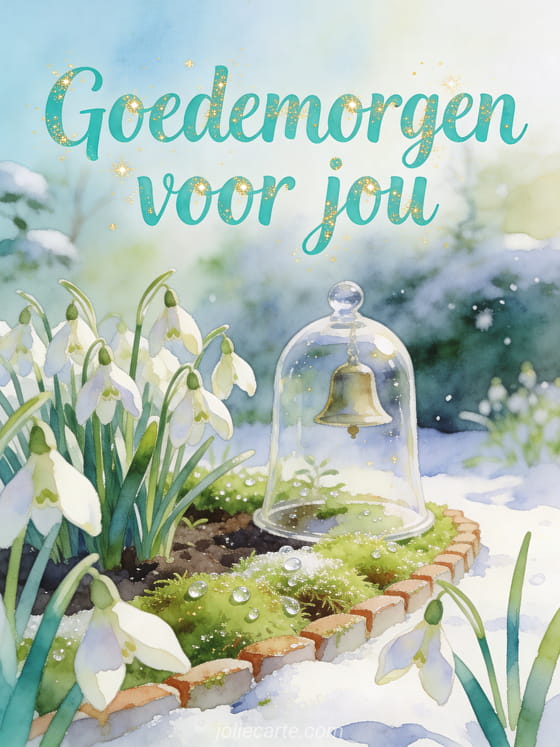 Stuur een delicate virtuele goedemorgen kaart met heldere aqua aquarelletters, sneeuwklokjes, een glazen stolp en dauwhelder mos in een frisse tuinhoek. Ontdek ook goedemorgen bericht voor mijn man, goedemorgen bericht aan een vriend of goedemorgen bericht voor de ochtend.