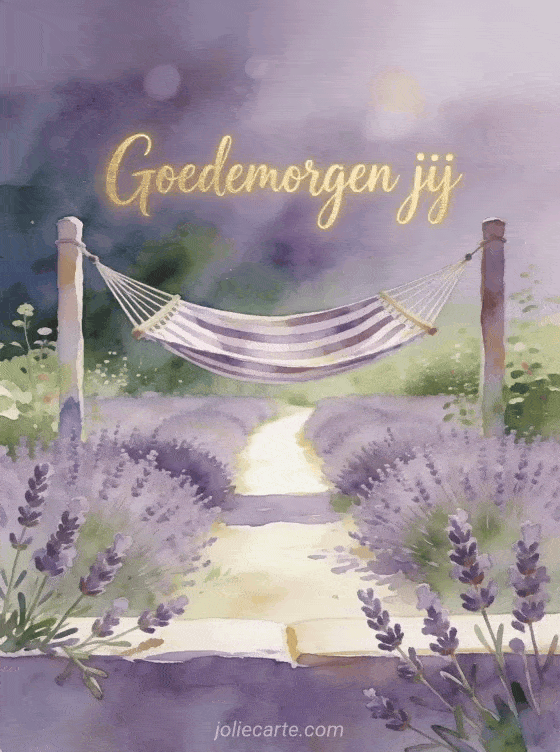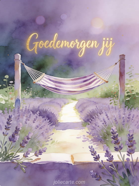 Stuur een vredige virtuele goedemorgen voor jou kaart met ontspannen violette aquarelletters, een gestreepte hangmat en lavendeltakjes naast een helder tuinpad. Ontdek ook goedemorgen bericht ochtend speciaal persoon, goedemorgen bericht voor je crush of goedemorgen bericht voor mijn mooie.
