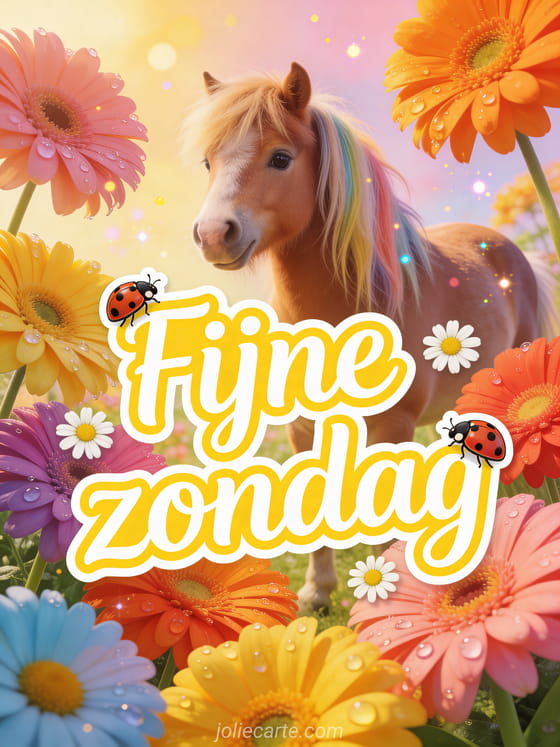Stuur een kleurrijke fijne zondag met felle gerbera's, lieveheersbeestjes, margrieten en een schattige Shetlandpony in warm gouden licht. Ontdek ook fijne zondag geanimeerde gif, mooie fijne zondag kusjes afbeeldingen of een mooie kaart fijne zonnige zondag.