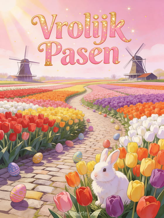 Stuur een adembenemende paaskaart met een panoramisch uitzicht op Keukenhof tulpenvelden in volle bloei, eindeloze rijen veelkleurige tulpen en twee hollandse windmolens aan de horizon, een kasseien pad slingerend door de bloemen en beschilderde paasei verspreid langs het pad. Ontdek ook een tekst paaskaart of een kaart prettig paasfeest.