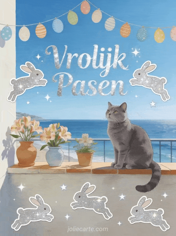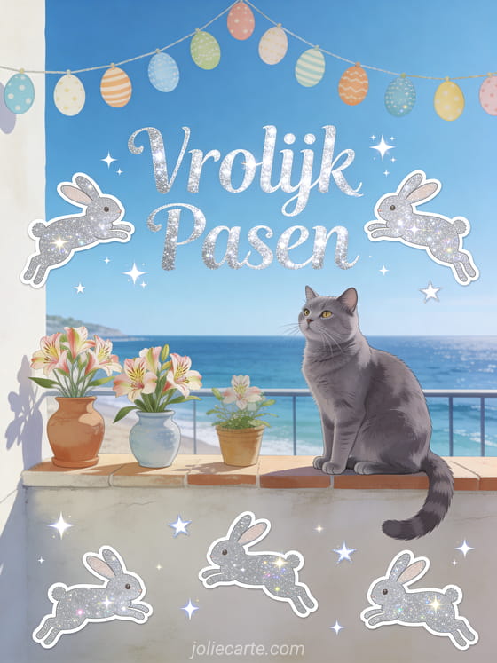 Stuur een stijlvolle paaskaart met een majestueuze chartreux kat zittend op een kuststenenmuur met de oceaan die zich uitstrekt tot de horizon, alstroemeria in keramieken potten langs het terras en een paaseierenslinger. Ontdek ook een wenskaarten vrolijk pasen of een virtuele vrolijk pasen kaart.