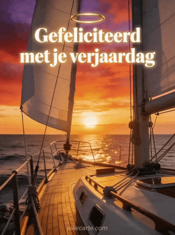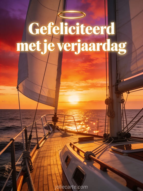 Vier zijn verjaardag met het gevoel van maritieme vrijheid. Een spectaculaire zonsondergang boven de oceaan vanop het dek van een houten zeilboot, met touwen, reling, witte zeilen en een vuurrood oranje paarse lucht. Ontdek ook een geanimeerde verjaardagskaart man of een wensen verjaardag man.