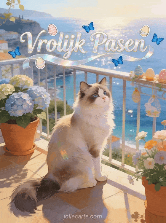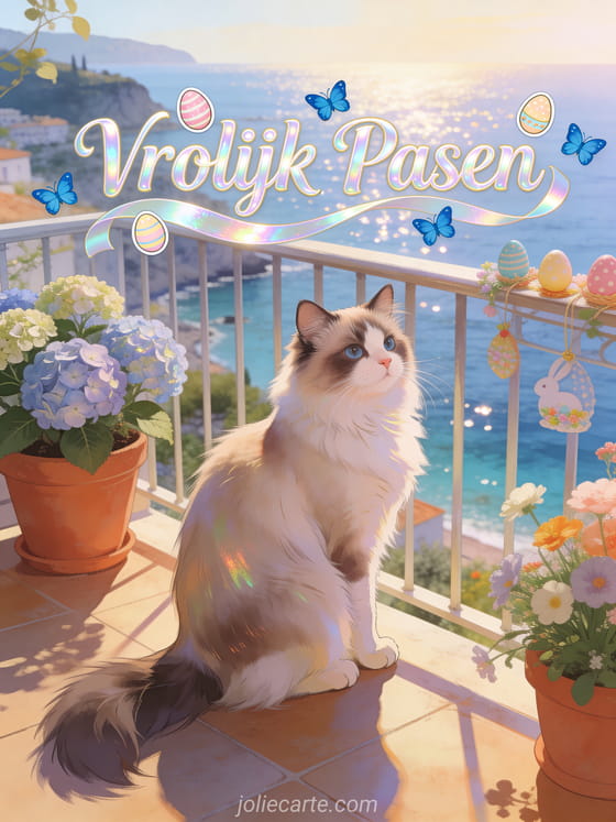 Stuur een elegante paaskaart met een ragdoll kat die sierlijk zit op een balkon met uitzicht op een Mediterrane baai, terracottapotten met hortensias en lentebloemen en paasversieringen op de reling. Ontdek ook een mooie gratis virtuele paaskaarten of een kaarten fijn paasfeest.