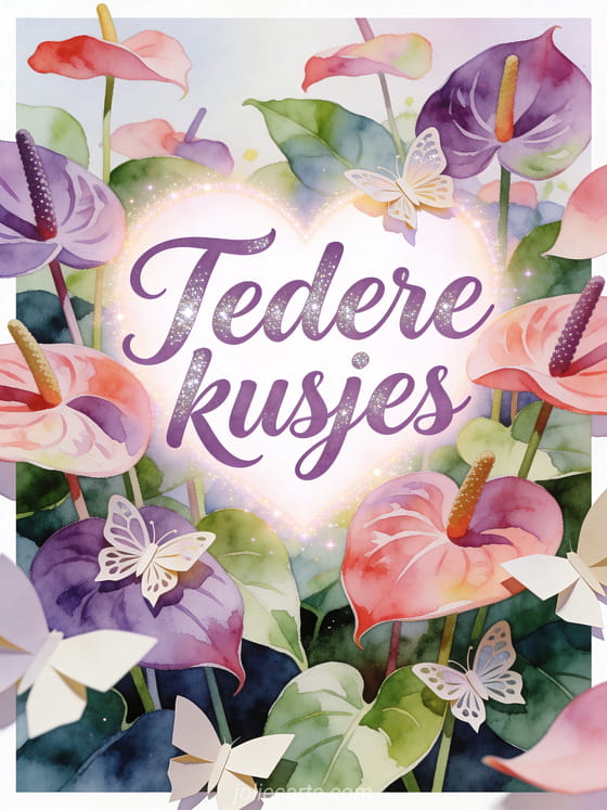 Deel een vlinderkusjes gif met zachte mauvekleurige kalligrafie, een tropische anthuriumtuin, gloeiende hartjes en delicate papieren vlinderornamenten tussen de bloemen. Je kunt ook een gratis kusjes afbeelding, veel kusjes geanimeerde gif of kusjes hond gif sturen.