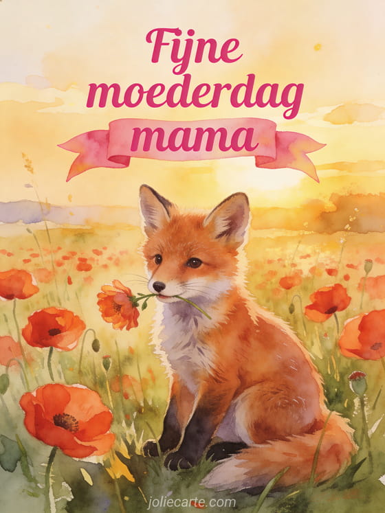 Verras mama met dit poëtische voorbeeld van een moederdagkaart met een schattige rode vos in een veld klaprozen bij zonsondergang. Bekijk ook moederdag gif of moederdag foto's.