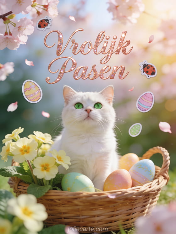 Stuur een prachtige paaskaart met een wit katje met heldere groene ogen in een rieten mand omringd door lenteprima's en geschilderde paasei, met kersenbloesem op de achtergrond. Ontdek ook een citaat vrolijk pasen of een gratis pasen afbeelding.